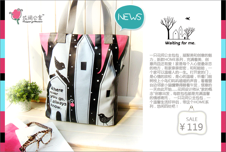 一只花间公主包包,凝聚美和创意的魅力,新款HOME系列,充满着美、创意而且还有爱!家是每个人心里最依恋的地方,有家亲亲密密,和和睦睦,一个家可以温暖人的一生。打开家的门,是心情的放松,是心的温暖,听着门前树枝上小鸟们叽叽喳喳的声音,看着窗台边邻家小猫慵懒得睡着午觉,惬意的一天由此开始……花间设计师从“家的概念”创意出发,每款包包都是充满温馨的情感寄托, 一只花间公主包包,一个温馨生活好伴侣,带这个HOME系列,悠闲四处吧!