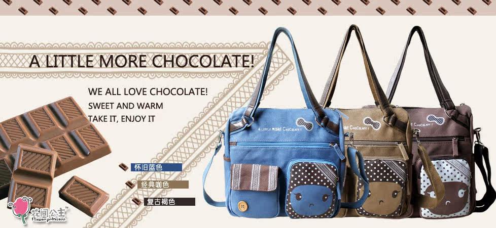 花间可爱萌萌最新款——巧克力系列由花间设计师Miaggie倾力呈现。此款将巧克力的味道一一呈现,蕾丝图案设计、萌萌的原创表情,圈圈点点的布局,让包包“香醇丝滑”无法抵挡,感受与众不同,展现您更具可爱的搭配风格。