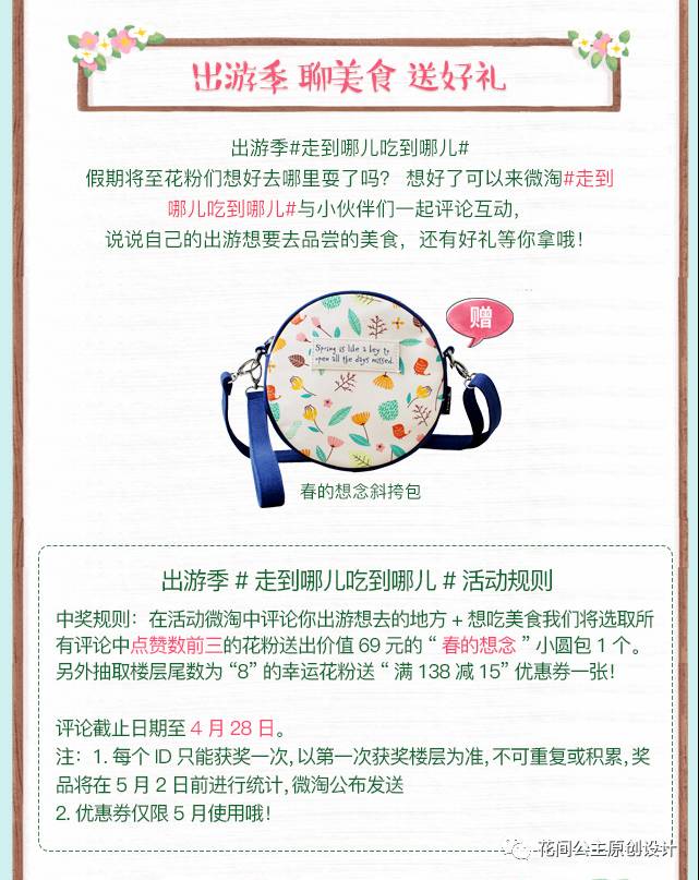 中奖规定:在活动微淘中评论你出游想要去的地方+想吃的美食我们将选取所有评论中点赞数前三的花粉们送出价值69元的“春的想念”小圆包1个另外抽取楼层尾数为8的幸运花粉们送满138减15的优惠券一张