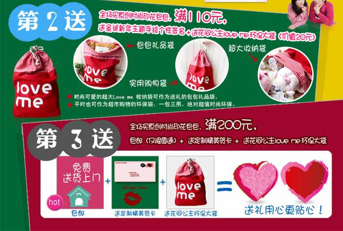 第二送:全场买原创时尚印花包包,满110元,送圣诞新年主题手绘个性签名+送花间公主love me环保大袋