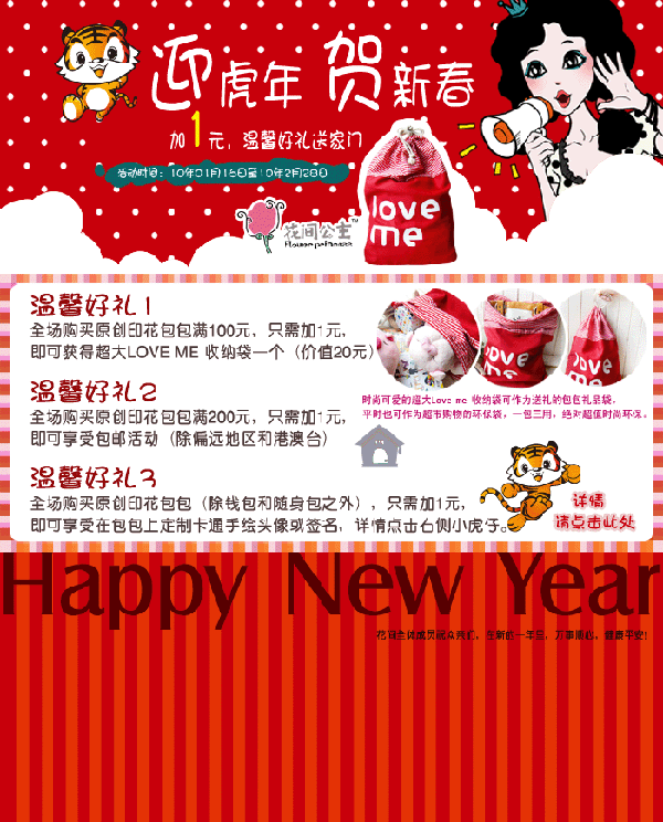 为了迎虎年,贺新春,花间公主官方淘宝店回馈广大客户,举办加1元,可获取3份温馨大好礼活动,详见http://shop36682954.taobao.com/shop/xshop/wui_page-cat-36682954-138641370-u+62rw==.htm?checkedRange=true: