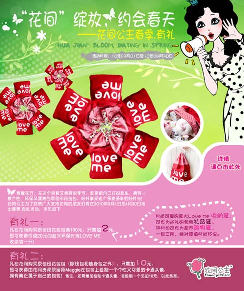 春暖花开,在这个短暂又美丽的季节,赶紧把自己打扮起来,拥有一款个性又漂亮的原创印花包包,好好享受这个多姿多彩的好时光!花间公主回馈广大支持花间的朋友们。将在2009年3月1日至4月30日推出春季.有礼活动,详见如下